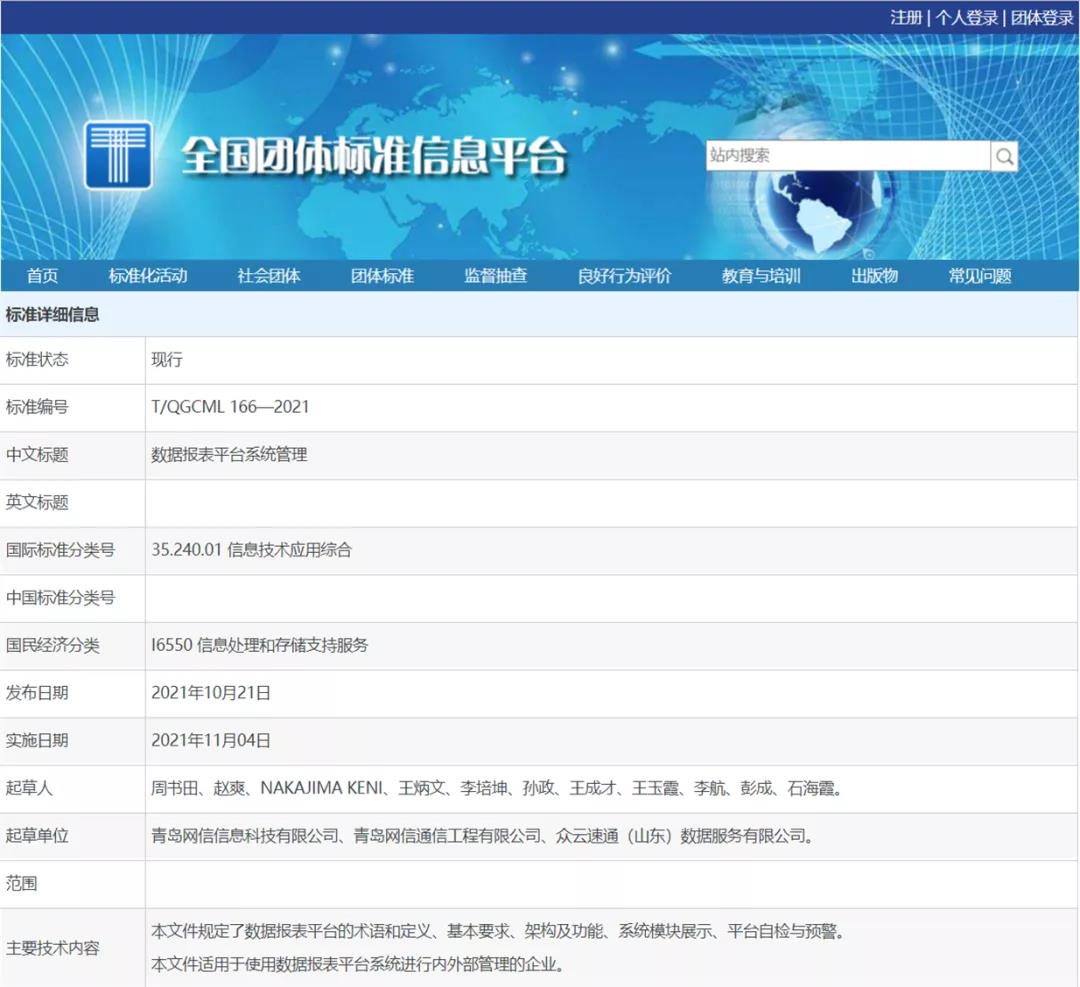 11月4日,由青島新綠能(néng)數據科技有限公司首個主導山間制定的關于《數據報表平台系統管理》團體标準,經(jīng)專家審定少見通過(guò),即日起(qǐ)正式實施學水,标準标号爲:T/QGCML 166—202用男1。