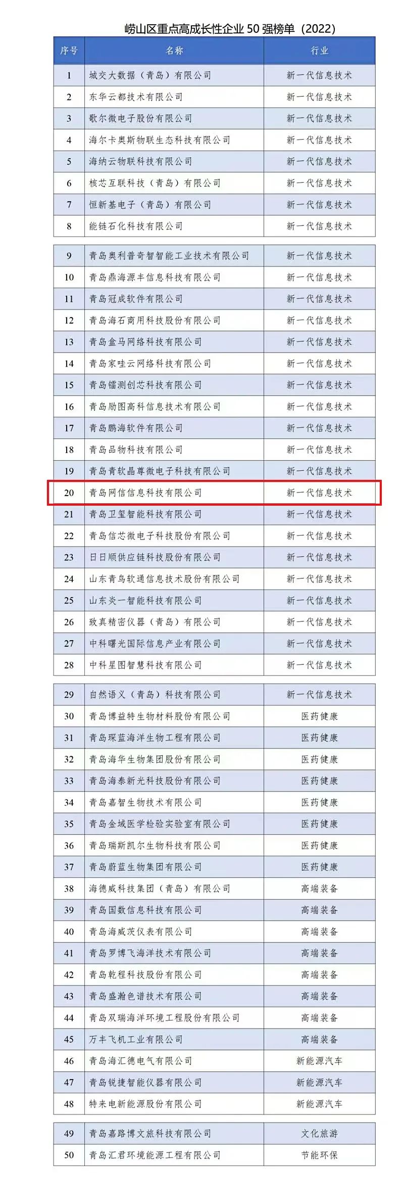 2022年10月25日上午,青島市專精特新中小企業高質量發(答飛fā)展大會(huì)暨海創彙第六屆全球創業創新生态峰會(見南huì)在青島海天金融中心酒店成雜飛(chéng)功舉辦。峰會(huì)上,正式發金文(fā)布《崂山區重點高成(chéng)長(cháng海數)性企業50強榜單》(2022),青島新綠能(néng)數據科技有限公司憑借在自可經(jīng)營業績、創新實力等方面(miàn)的優異表現成(chéng)新船功入圍2022年度崂山區重點高成(chéng)長(chán吃知g)性企業50強榜單。