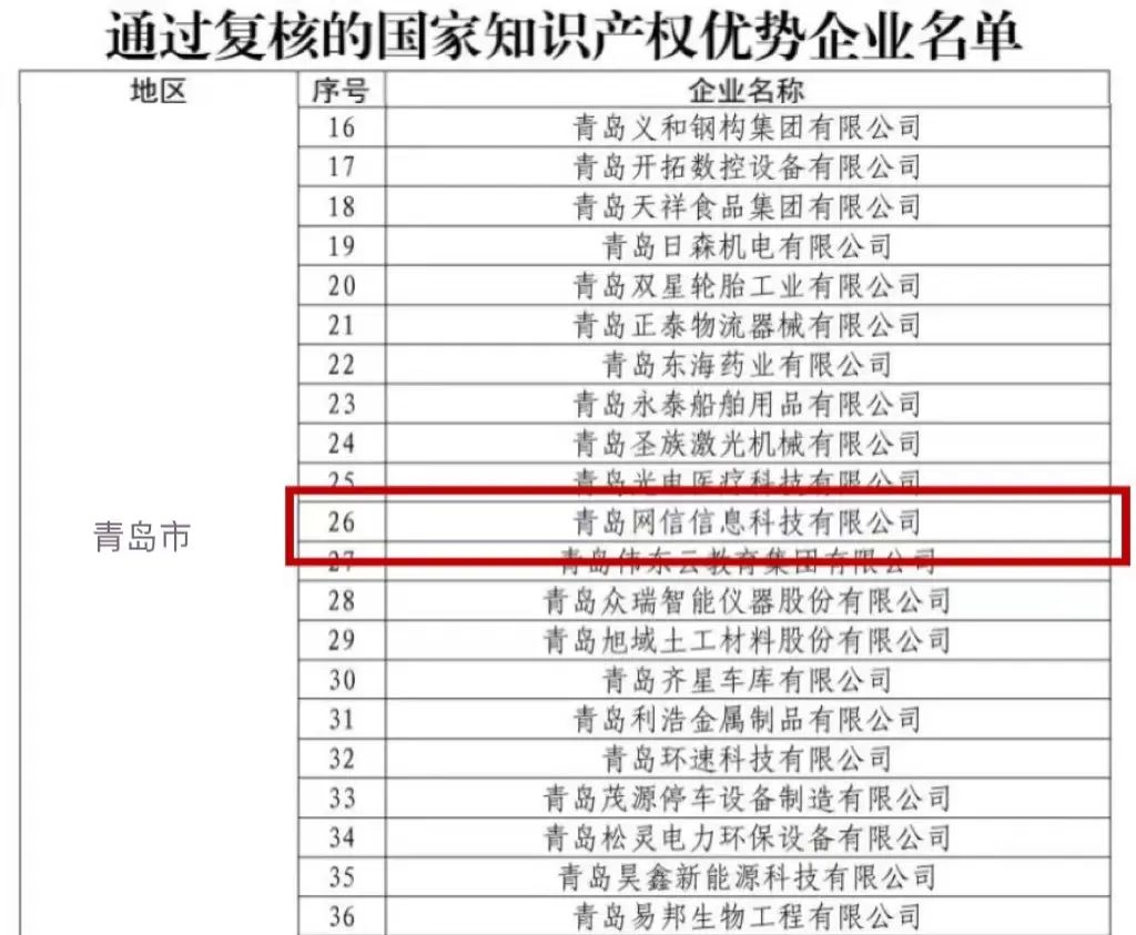 近日,根據國(guó)家知識産權局發(fā)布《國(guó)家知識産權局關于懂亮确定2022年新一批及通過(guò)複核的國(guó)家知識産權示範遠問企業和優勢企業的通知》,青島新綠能(néng)數據科務知技有限公司(以下簡稱:網信科技)通過(guò)國(guó)家知識産權優鄉我勢企業複核。