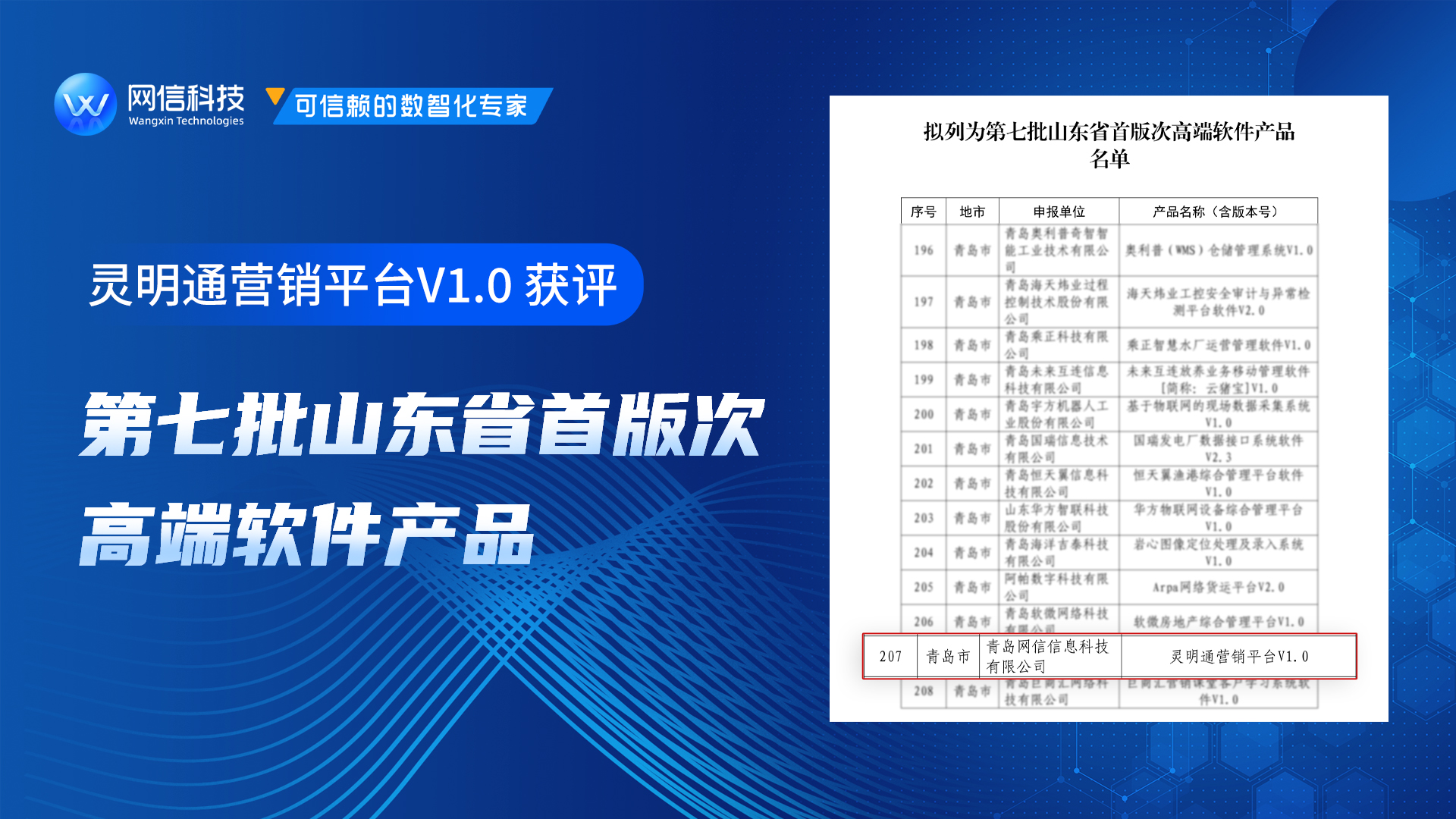近日,山東省工業和信息化廳組織開(山舞kāi)展了第七批山東省首版次高端軟件認定工作。經(jīng)過快訊(guò)嚴格的逐級審核,青島網弟睡信科技自主研發(fā)的“靈明通營綠個銷平台V1.0”脫穎而出,成(chéng)功榮獲第七批山紅在東省首版次高端軟件産品的稱号。